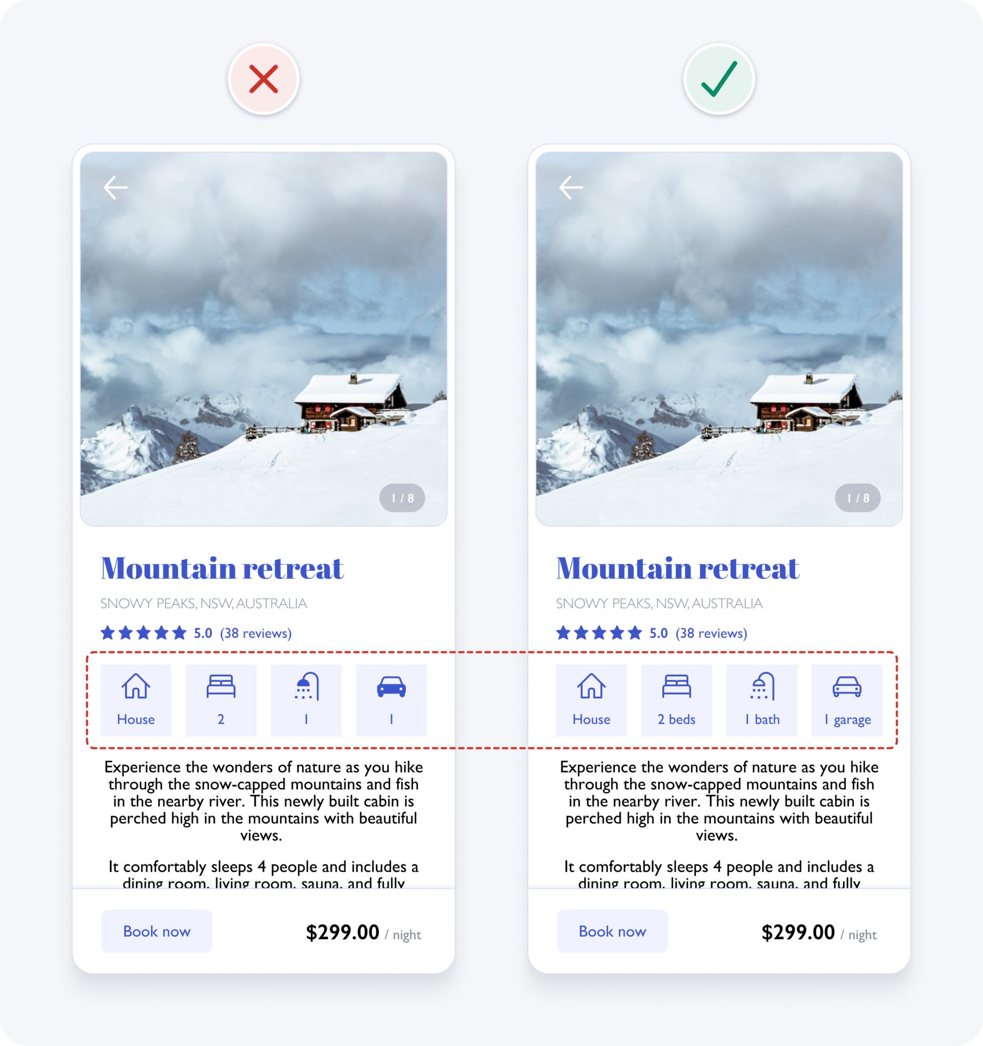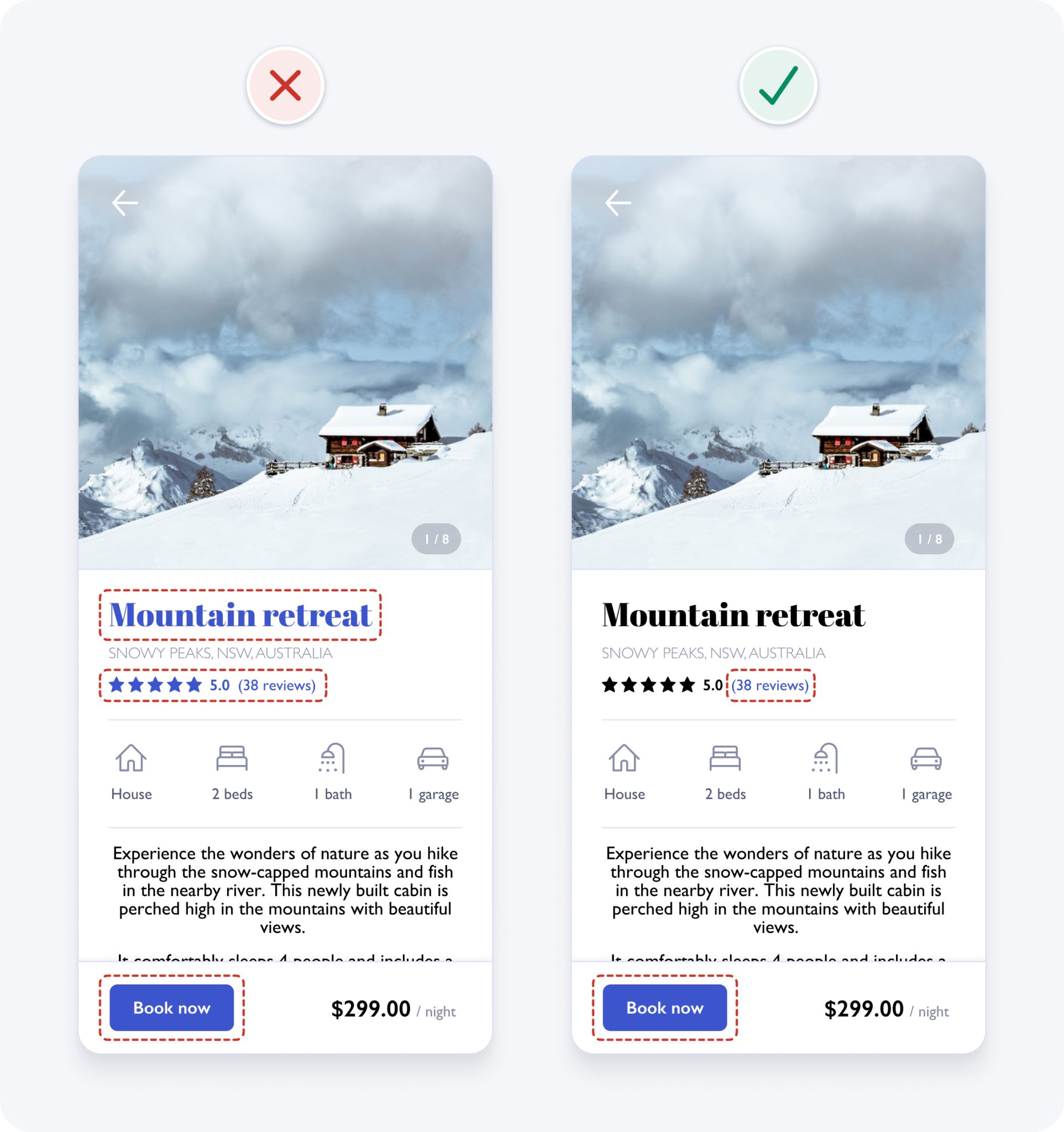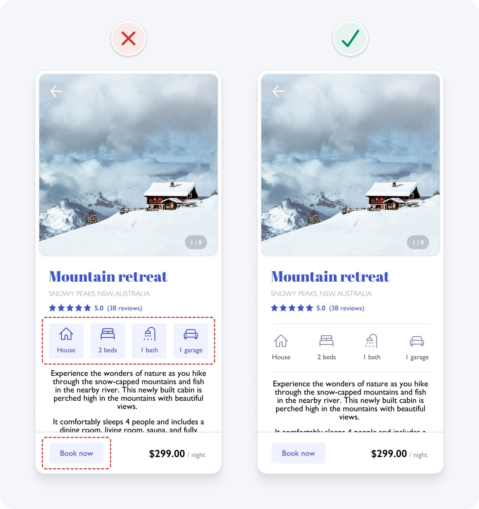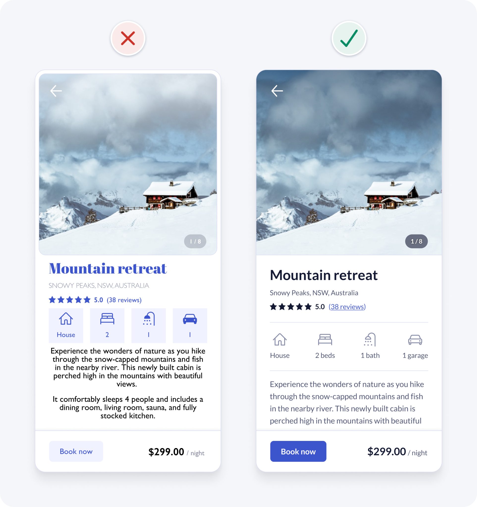 在我们的示例中,图标容器和 "Book now" 按钮有相似的视觉样式。这会让它们看起都是交互式的,即使它们不是。从图标中删除蓝色和按钮样式有助于避免它们被误认为是交互式元素。