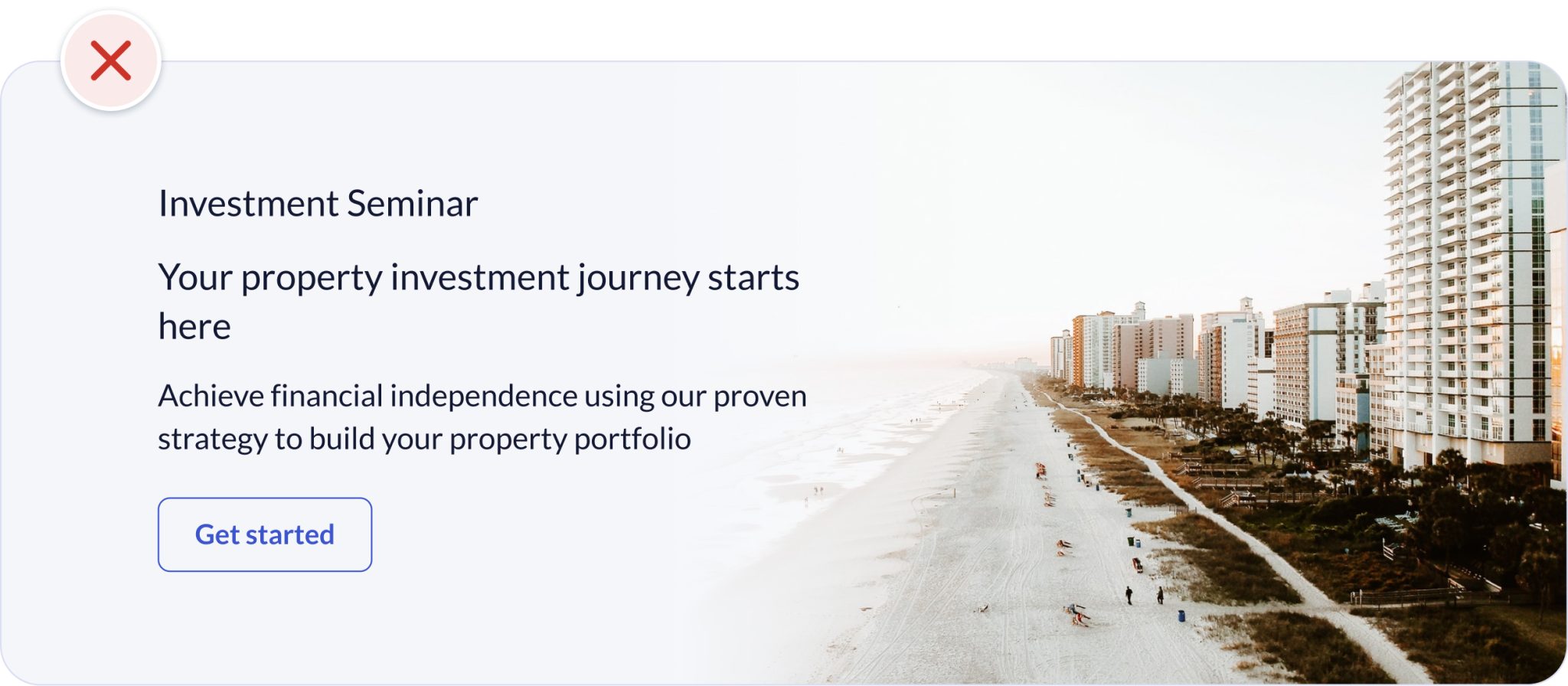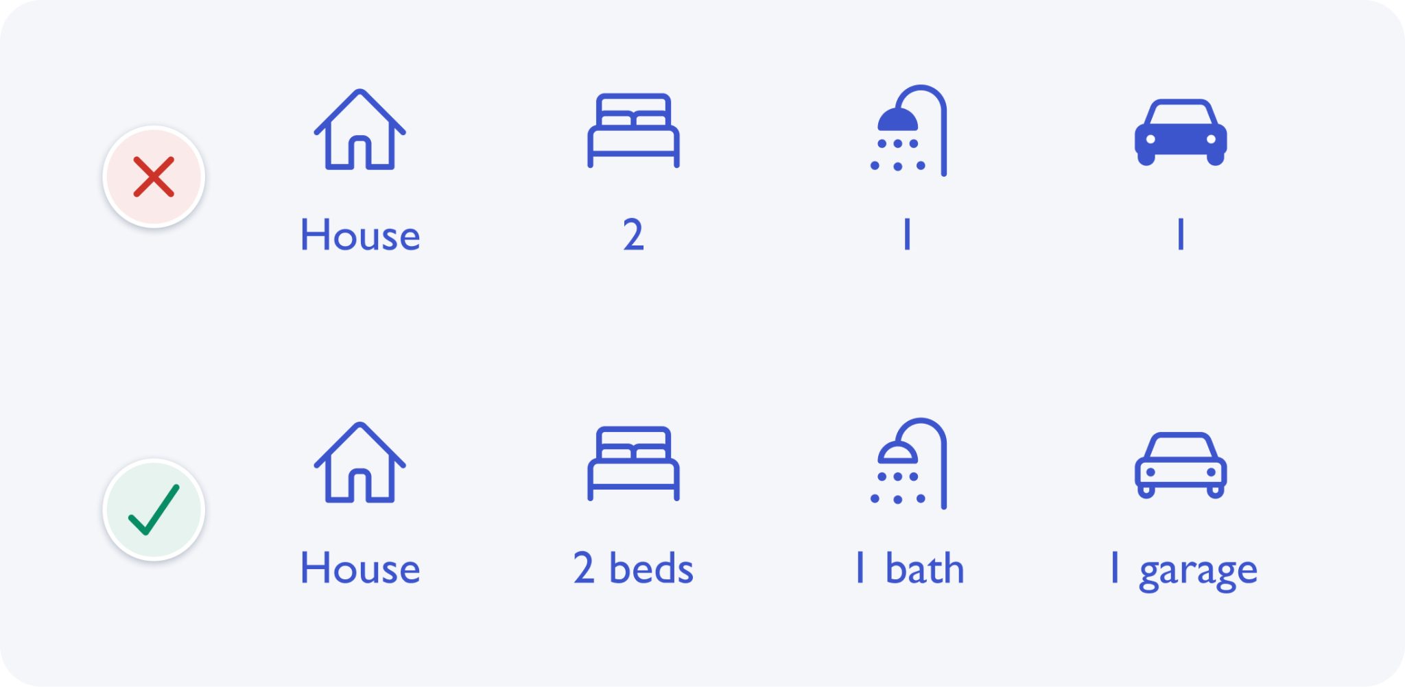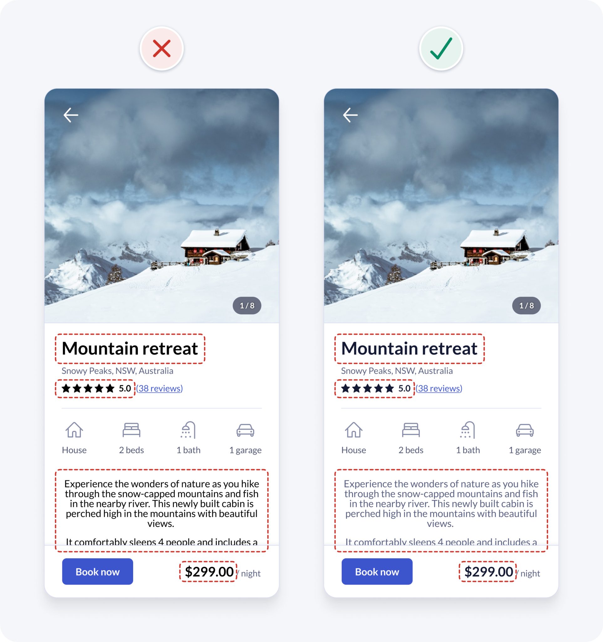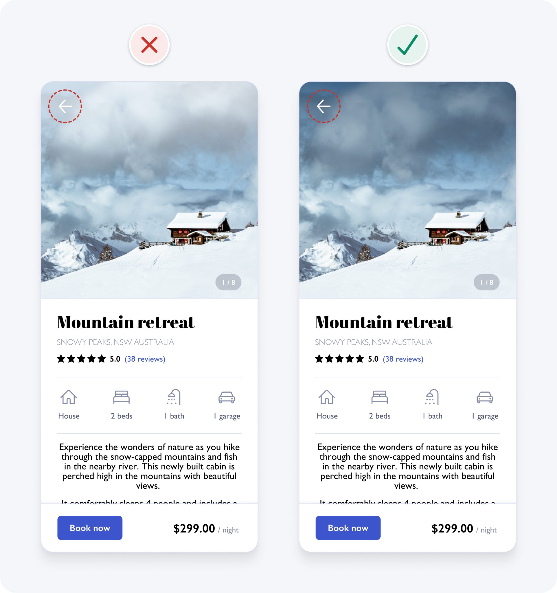 在我们的示例中,图标容器和 "Book now" 按钮有相似的视觉样式。这会让它们看起都是交互式的,即使它们不是。从图标中删除蓝色和按钮样式有助于避免它们被误认为是交互式元素。