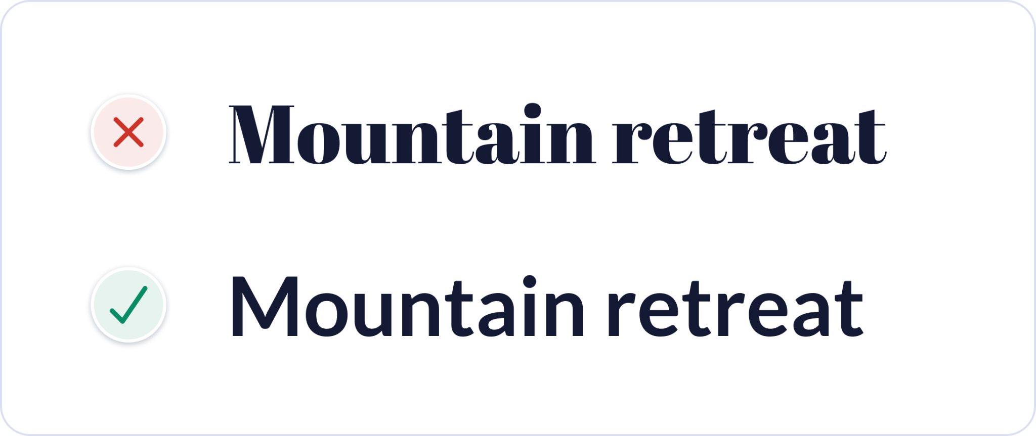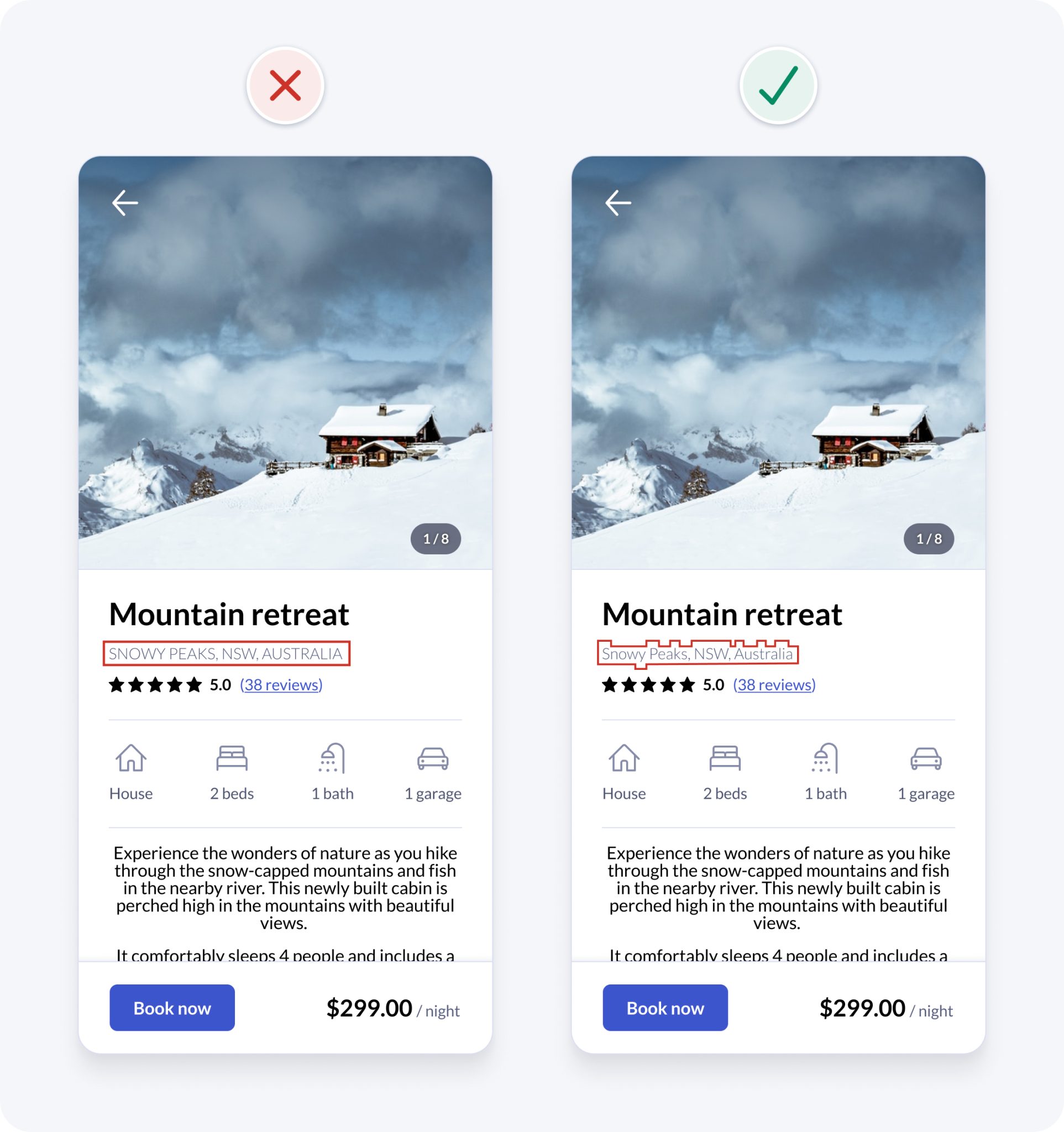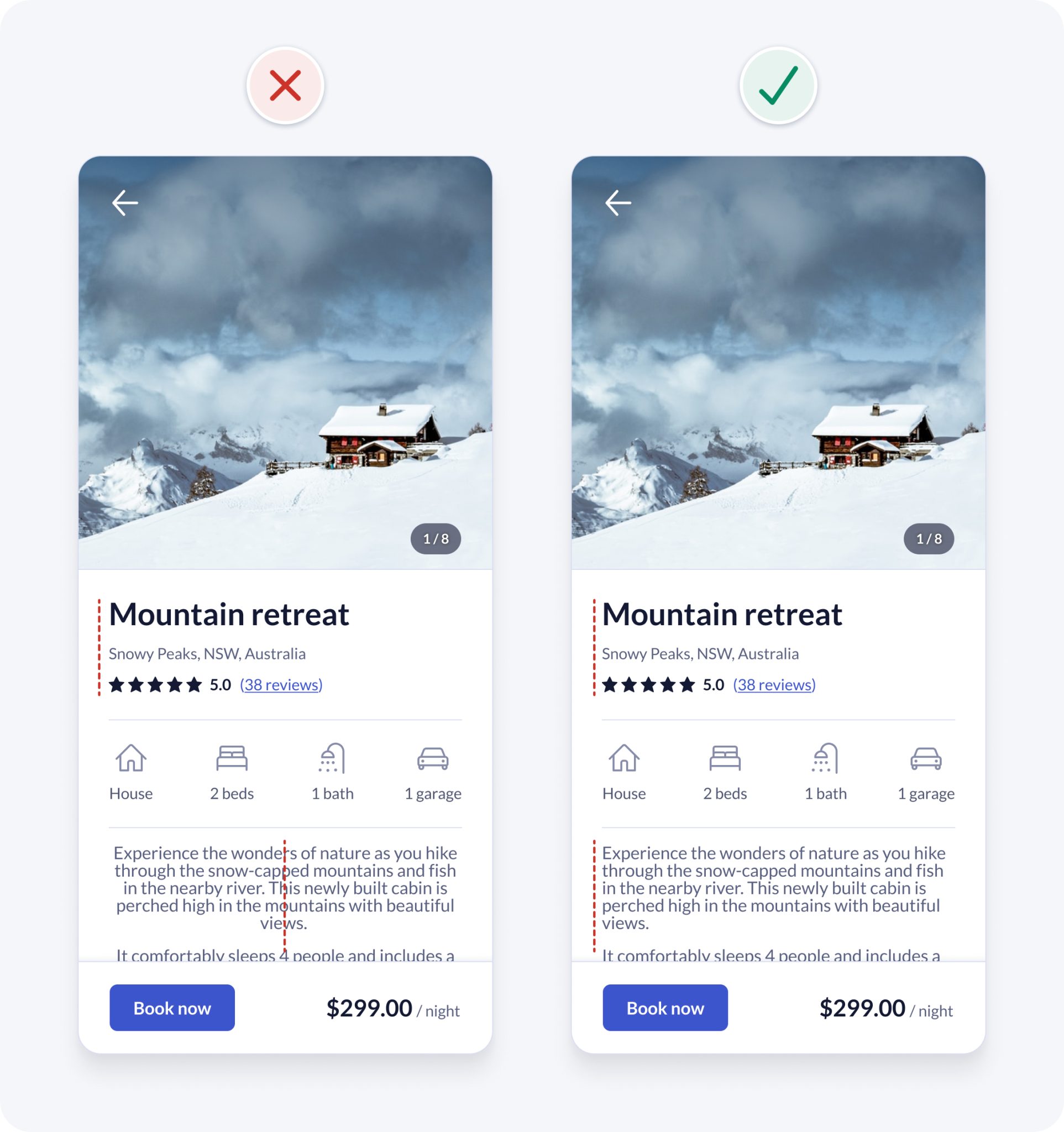 在我们的示例中,标题使用了详细的衬线字体,这有点难以阅读,可能会分散某些人的注意力。它还具有可能与此物业租赁应用程序中的某些照片不匹配的个性。使用无衬线字体简化它有助于提高可用性和美观性。