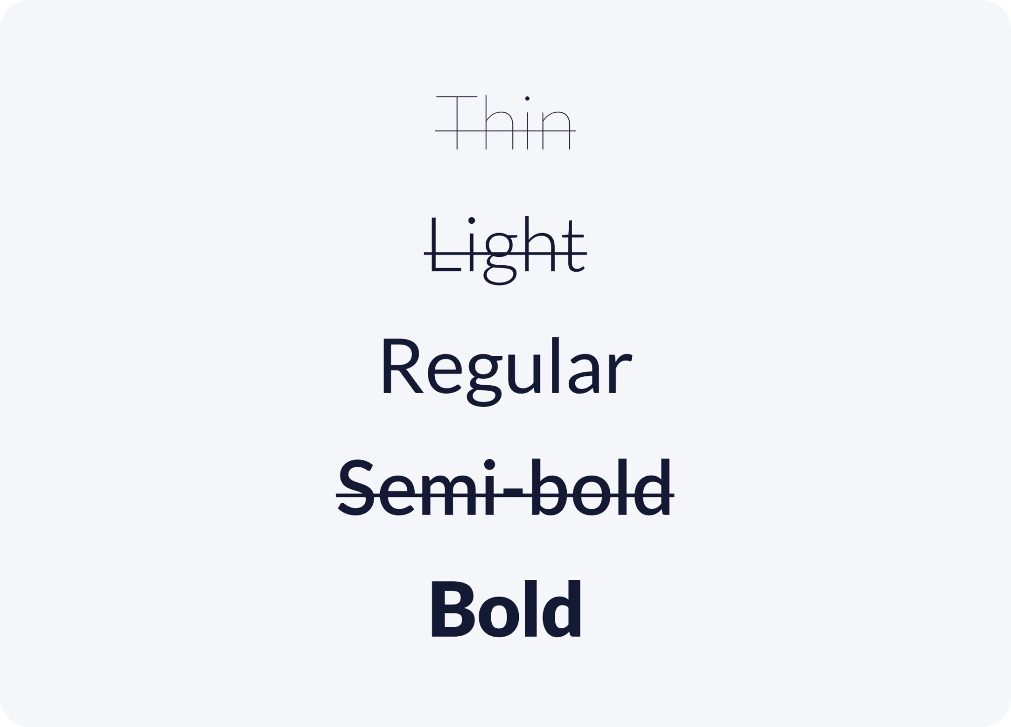 - 如果您决定使用非常细或较粗的字体粗细,请将它们保留用于标题和较大的文本,因为它们可能难以以较小的尺寸阅读。