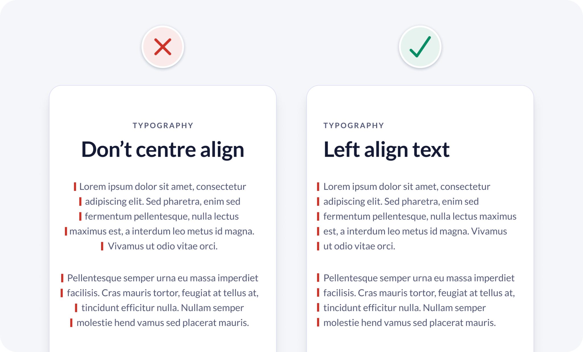 英语从左到右,以F形模式向下阅读。因此,最好保持文本左对齐以获得最佳可读性。对于长正文文本,最安全的做法是避免居中对齐或对齐的文本。阅读起来更加困难,尤其是对于那些有认知障碍的人来说。