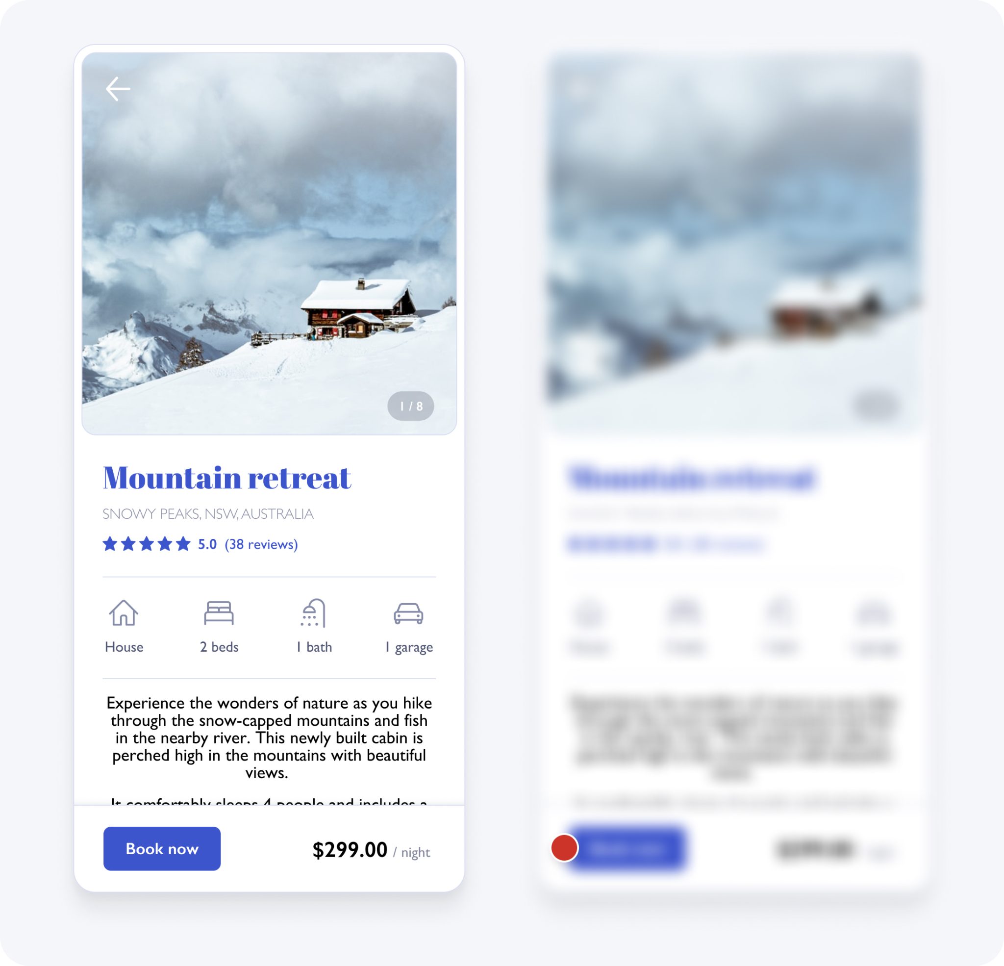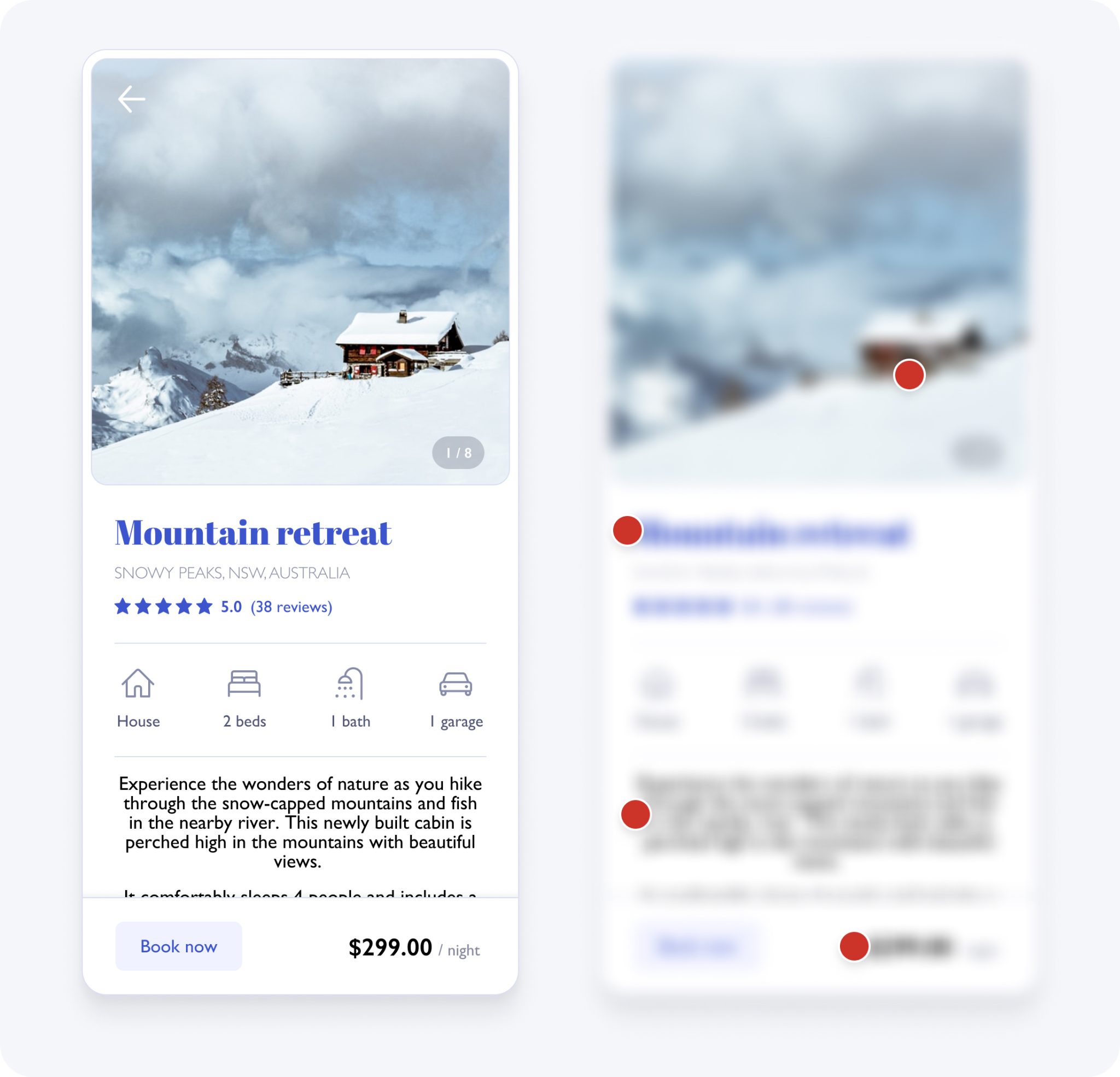 如果想要测试你的视觉层次结构是否清晰,一种快速简便的方法是使用斜视测试。只需眯起眼睛,看看你的设计。或者,可以远离屏幕或模糊你的设计。你仍然应该能够分辨出最重要的元素是什么,并识别界面的用途。