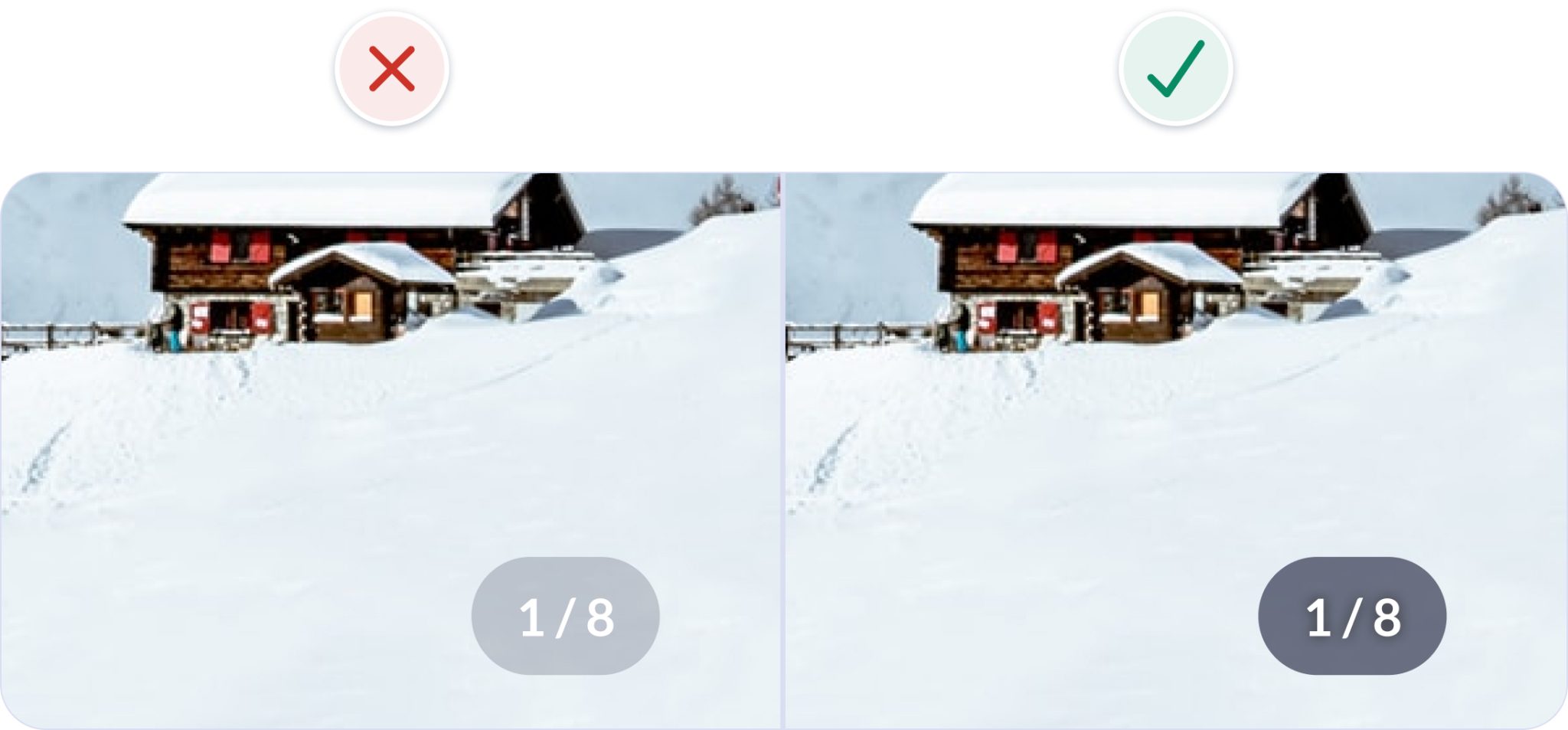 在我们的示例中,照片计数元素中的小文本对比度不足。我们通过增加灰色容器的不透明度并添加文本阴影,将对比度提高到 4.5:1 以上。