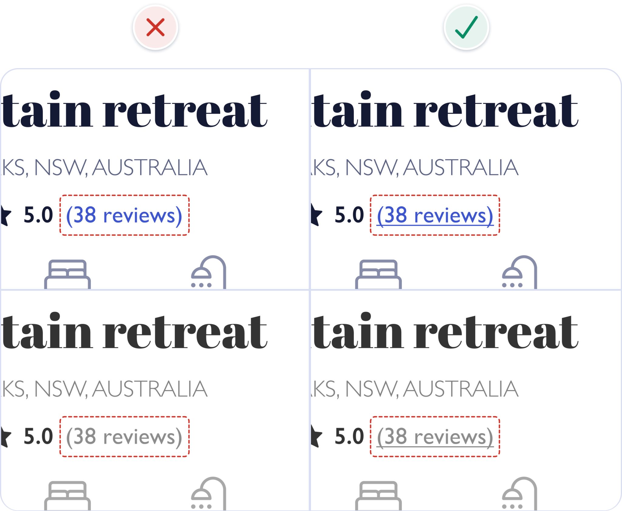 在我们的示例中,“评论” 文本上使用蓝色来表示它是一个链接。如果删除颜色,则链接文本看起来与其他文本相同,因此色盲无法判断它是链接。在没有颜色的情况下,为链接文本添加下划线可以清楚地将其与其他文本区分开来。